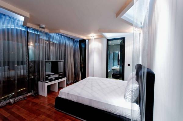Още с влизането ще забележите футуристичния интериорен дизайн – под от черен мрамор и гранит, стени от естествен светещ оникс, черен таван на 8 метра височина с вградено озвучаване. Околo стъклокерамичната рецепция във фоайето има многобройни огледала, които придават обем на пространството, а в непосредствена близост до тях ромоли водна завеса.
