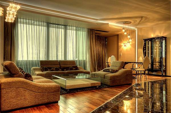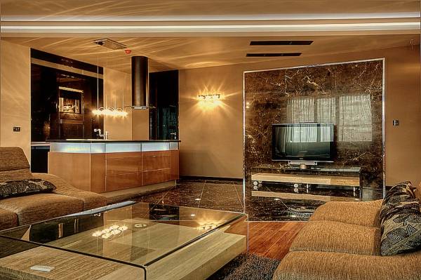 Стените на луксозните дневни са изпълнени с декоративна италианска мазилка, облицована с черен камък, а на спалните – облицовка от висококачествен MDF. Елегантните тънки и плътни завеси са с дистанционно управление, за да може лесно и удобно да решавате кога да е ден, кога – нощ. Това се случва благодарение на 100% светлонепропускливите плътни завеси. Подовите настилки в апартаментите са комбинация от паркет от индонезийска акация и черен гранит, а окачените тавани са специално изпълнение на Barrisol. В стаите има LED осветление, вградено в тавана, както и допълнителни кристални полилеи.